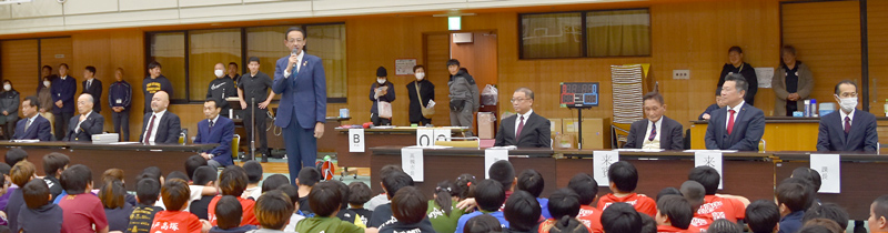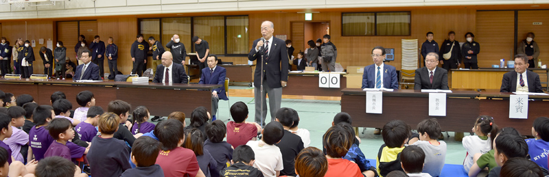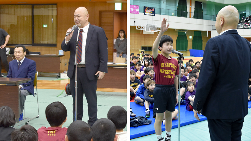 | あいさつ 高槻市レスリング連盟 会長 河内義雄 | 選手宣替 高槻市レスリング連盟 藤部大翔選手 |